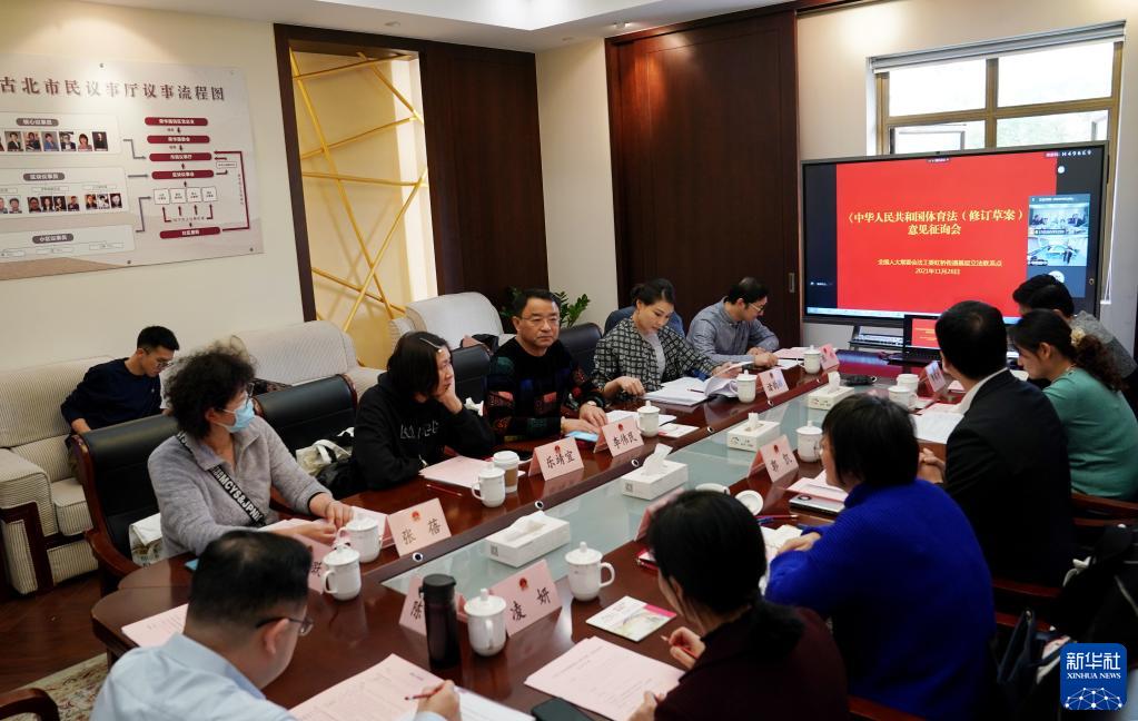 上海長(zhǎng)寧區(qū)虹橋街道基層立法聯(lián)系點(diǎn)召開(kāi)《中華人民共和國(guó)體育法(修訂草案)》意見(jiàn)征詢(xún)座談會(huì)(11月26日攝)。新華社記者 劉穎 攝