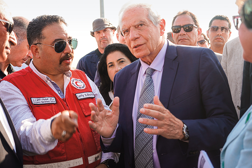 2024年9月9日,时任欧盟外交与安全政策高级代表博雷利在埃及和加沙地带交界地区的拉法口岸向当地工作人员了解情况