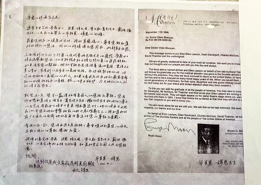 夏日的蝉噪将记者拉回到现实中,3栋白墙、红柱、青瓦的老建筑掩映在高大的槐树林中。坐北朝南的主楼是养病楼,劳森的截肢手术就是在二楼进行的。如今,手术室仍保持着当年的样子,仿佛时间就定格在那一刻。在一间陈列室,记者看到了曾在此处接受治疗的3位杜立特行动飞行员及劳森妻子艾伦写给陈慎言的信,那是1996年9月11日,陈慎言已病危。几位美国友人在信中说:“如果没有您的帮助,他们(飞行员)可能已无法活着返回美国,更谈不上养儿育女,享受到以后多年的美好生活。当你救起他们时,你同时也救助了美国的几代人……就凭这一点,您可以赢得所有美国人的感谢与尊敬……”