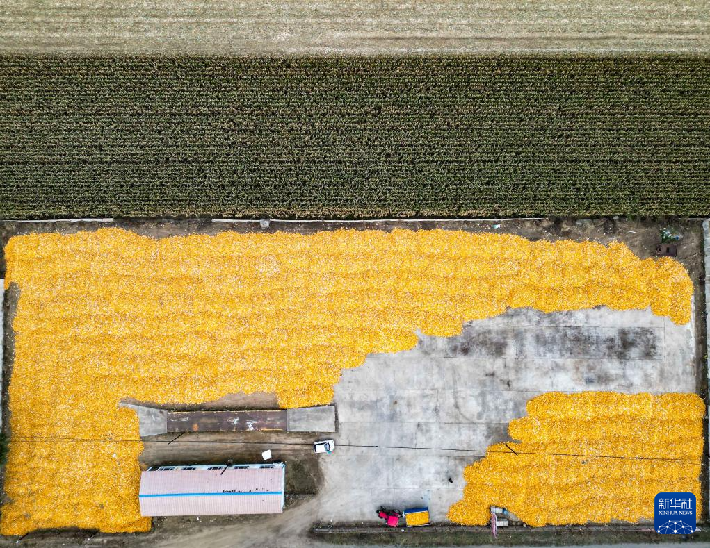 这是10月9日拍摄的吉林梨树正在秋收的玉米地(无人机照片)。