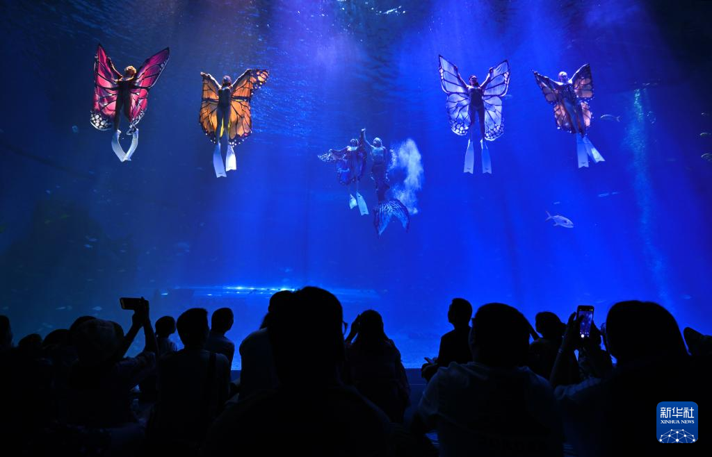 10月18日,游客在海南海洋欢乐世界度假区观看水下表演。