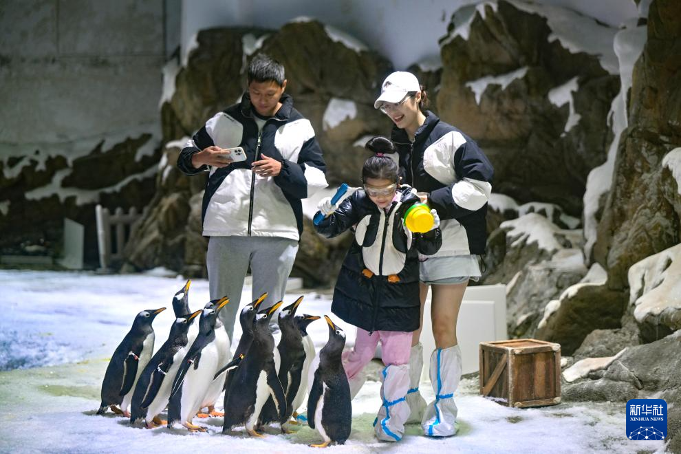 10月18日,游客在海南海洋欢乐世界度假区体验喂食企鹅。