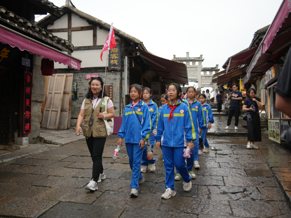 探访青岩古镇,孩子们在明代城墙上学习攻防知识,了解古镇作为茶马古道商驿的往昔繁华,苗族蜡染体验中,她们用蜡刀勾勒图案,经历染色、脱蜡、烘干,完成独一无二的作品。