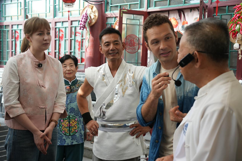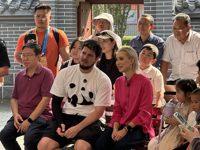 9月28日,主持人耶果(右二)、新华网新媒体主持人小爱(左一)在杂技小院中与杂技艺人交流。(司萌慧 摄)